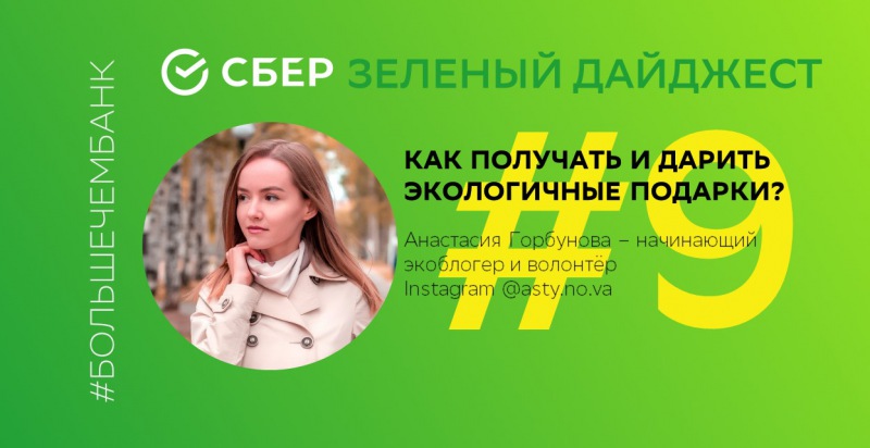 'Зеленый дайджест' Сбера: как получать и дарить экологичные подарки?Новый год – это то время, когда мы хотим оставить что-то в прошлом, начать жизнь с чистого листа. Может пора сделать первый шаг в сторону экологичной жизни и начать с выбора подарков? Сегодня гостьей «Зеленого Дайджеста» Сбера стала Анастасия Горбунова – начинающий экоблогер и волонтер. Мы попросили Настю рассказать*, какие презенты можно запланировать на Новый год для близких, чтобы не навредить окружающей среде.