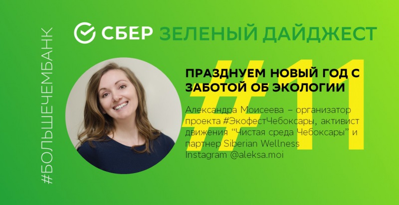 'Зеленый дайджест' Сбера: празднуем Новый год с заботой об экологииНовый 2021 год подкрался совсем незаметно. Осталась ровно неделя, чтобы оценить свои ресурсы и подготовиться к празднованию долгожданного праздника года. Мы предлагаем сместить фокус внимания и провести этот день максимально экологично. Можно ли провести Новогодние праздники как настоящие «зеровейстеры» в финальном выпуске «Зеленого Дайджеста» Сбера мы попросили рассказать Александру Моисееву, организатора проекта #ЭкофестЧебоксары, активиста движения “Чистая среда Чебоксары” и партнера Siberian Wellness**.