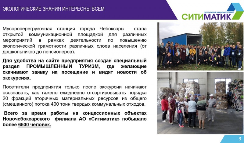 Новочебоксарский филиал АО «Ситиматик» был признан победителем среди лучших практик в номинации «Лучшая производственно-экологическая экскурсия». Программа промтуризма осуществляется на предприятии с 2015 года соответствует международным принципам устойчивого развития и «ГОСТ Р ИСО 13810-2016 Туристские услуги. Промышленный туризм. Предоставление услуг».