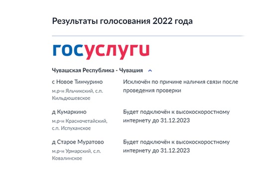 Сейчас специалисты проверяют условия подключения в населённых пунктах, которые выбрали участники голосования. На данный момент подтверждение на подключение к высокоскоростному интернету получили 12 деревень и сел Чувашии, ещё 13 населенных пунктов проходят проверку на наличие связи.