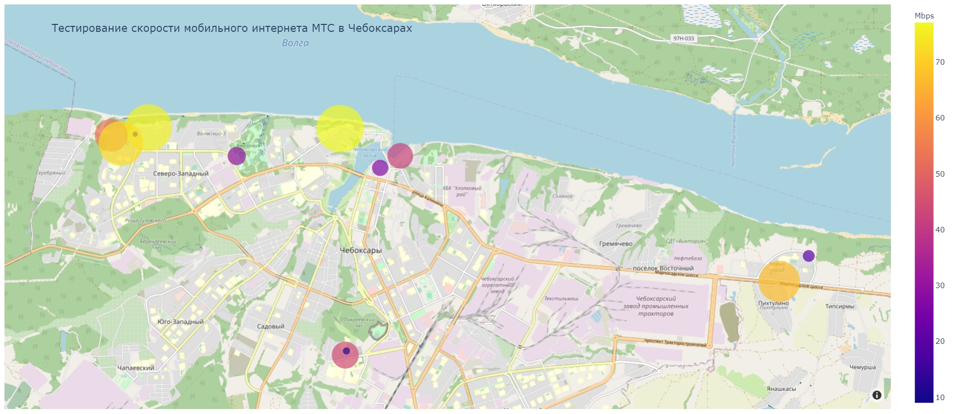 В микрорайоне "Новый город", на Чебоксарском проспекте у остановки "Пихтуллино" была достигнута максимальная скорость 59.5 Мб/с. На границе Нового города с лесополосой (ул. Прокопьева) – в финальной точке маршрута скорость скачивания в максимуме достигла 19.7Мб/с.