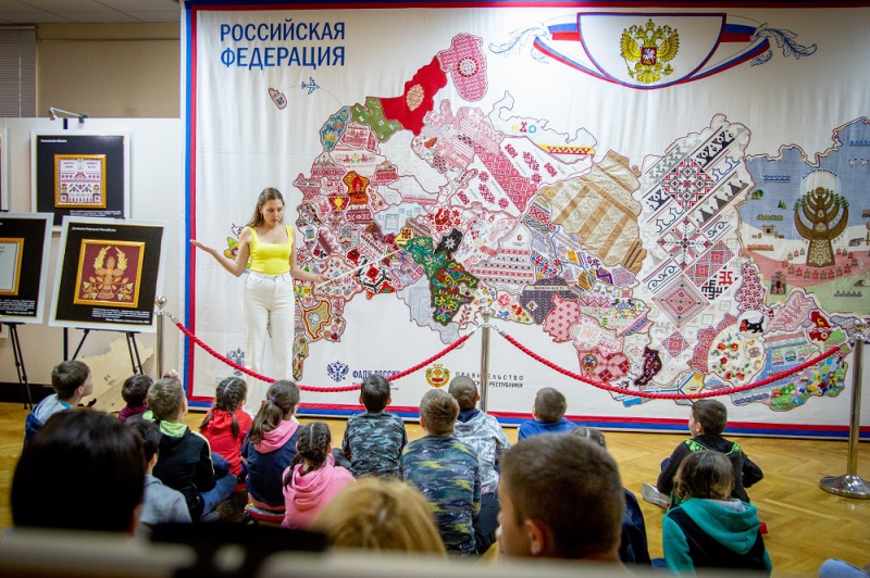 В Чувашском национальном музее дети познакомились с вышитой картой Чувашии и России, каждый ребенок нашел на карте свою малую родину. Они получили новые знания о регионах страны и их достопримечательностях.