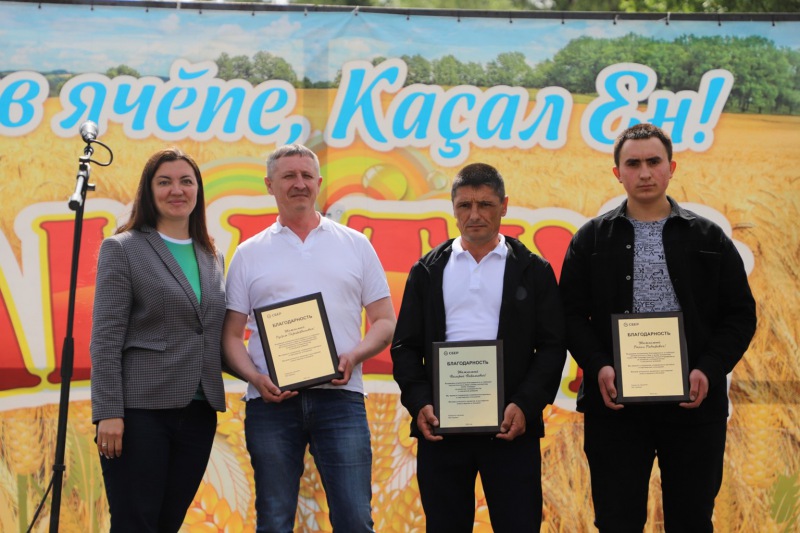 В честь праздника Сбер на главной сцене мероприятия заместитель управляющего Чувашским отделением ПАО Сбербанк Марина Михайлова наградила за сотрудничество трех ключевых клиентов, ведущих бизнес по развитию сельского хозяйства на территории Комсомольского муниципального округа: СХПК «Победа», крестьянско-фермерское хозяйство Ранила Шарафутдинова и ИП Рустема Салахутдинова.