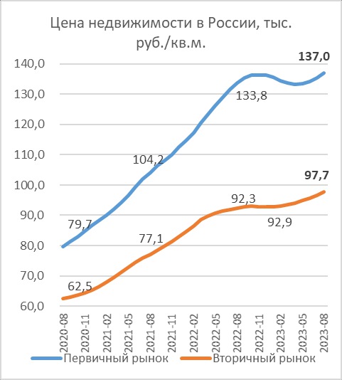 В августе цена на новостройки в России составила 137 тыс. руб., что на 2,4% выше значения прошлого года.