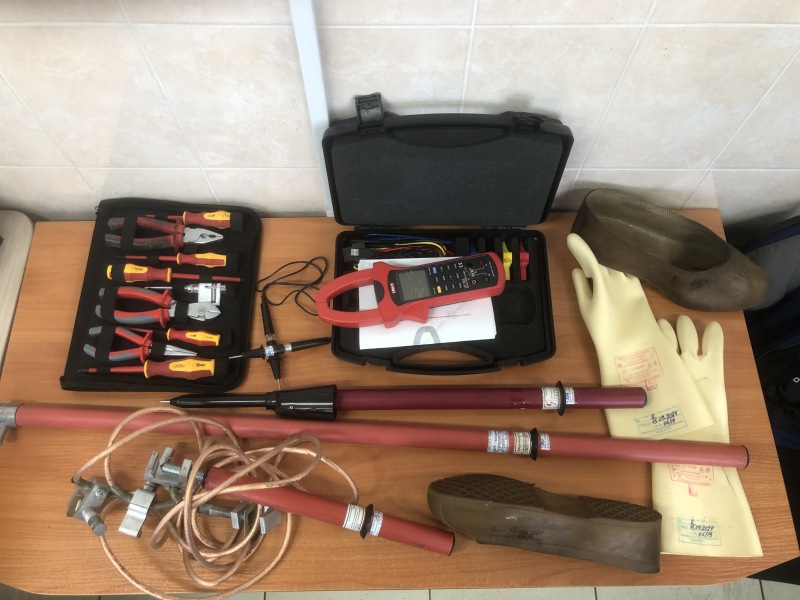 В набор специалистов отдела главного энергетика филиала входят: диэлектрические перчатки, клещи изолирующие и электроизмерительные, указатели напряжения, инструмент слесарно-монтажный с изолирующими рукоятками, штанги изолирующие, штанги измерительные, калоши диэлектрические.