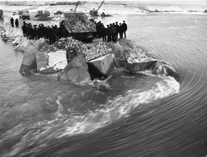 Штурм крупнейшей реки Европы подвел итоги 12-летнего возведения Чебоксарской ГЭС, объявленной Всесоюзной ударной стройкой. 4 ноября 1980 года в торжественной обстановке строители взорвали низовую перемычку, ограждающую сооружения гидроузла, и заполнили котлован водой. 8 ноября 1980 года в сложных условиях ледостава началось перекрытие Волги. Круглосуточно около сотни машин с сразу с двух берегов сбрасывали в воду связки 15-тонных глыб - бетонных кубов и тетраэдров, тысячи тонн песка и гравия. Впервые такая крупная река с большими расходами до 3000 м3/с была перекрыта пионерным методом. Штурм Волги продолжался 6 суток и 17 часов.