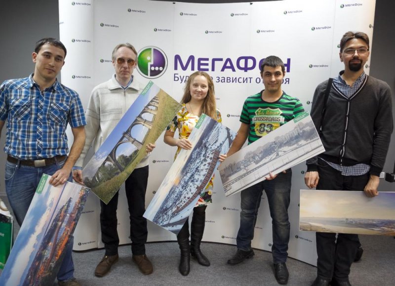 Авторы трех лучших панорам получили подарки от 'МегаФона'. В центре - победители выставки, крайний слева – Анатолий Овчинников, крайний справа – Александр Демьянов, тренерыВыставка высотных панорам столицы, прошедшая в офисе «МегаФона», показала горожанам, как и где можно использовать скоростной мобильный интернет 4G.