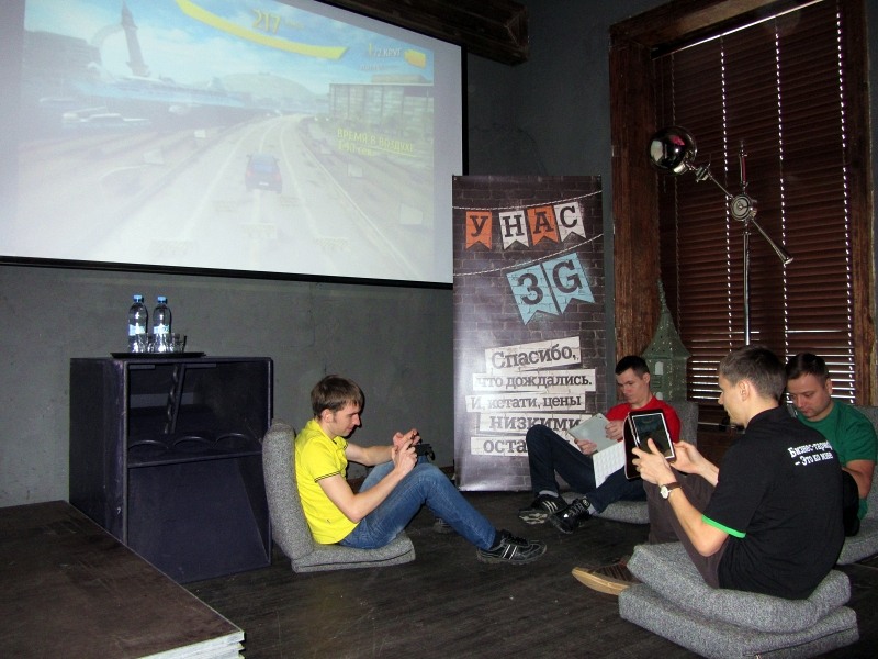 Повсюду в помещении клуба «Vася+1» можно было встретить флажки с надписью на черном кирпичном фоне в стиле Tele2 «У нас 3G. Спасибо, что дождались! Кстати, цены низкими остались».