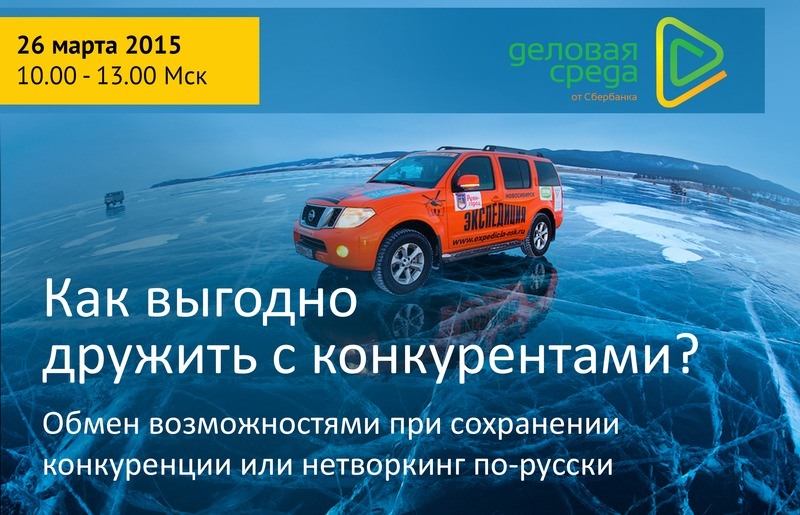 26 марта «Деловая среда» Сбербанка проведет общероссийский открытый семинар «Как выгодно дружить с конкурентами. Обмен возможностями при сохранении конкуренции или нетворкинг по-русски». Мастер-класс проведет заядлый путешественник и успешный бизнесмен, основатель бренда «Экспедиция» Александр Кравцов.