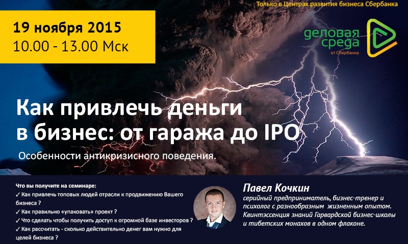 'Деловая среда' Сбербанка организует мастер-класс по привлечению инвестиций в бизнес19 ноября «Деловая среда» Сбербанка организует общероссийский открытый семинар «Как привлечь деньги в бизнес». Проведет мастер-класс предприниматель и бизнес-тренер Павел Кочкин.