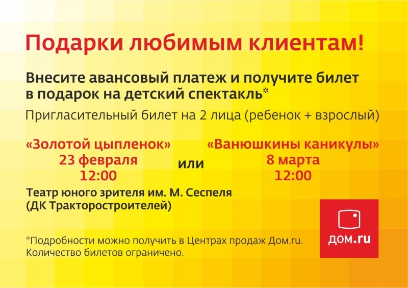 'Дом.ru' дарит своим клиентам билеты в театрТелеком-оператор «Дом.ru» к предстоящим праздникам приготовил подарок своим клиентам – пригласительный билет на детский спектакль в Театр юного зрителя им. М.Сеспеля. Оператор поддержал ежегодные акции ТЮЗа «В театр с папой» и «В театр с мамой». Клиент сможет выбрать билет на 23 февраля, либо 8 марта.