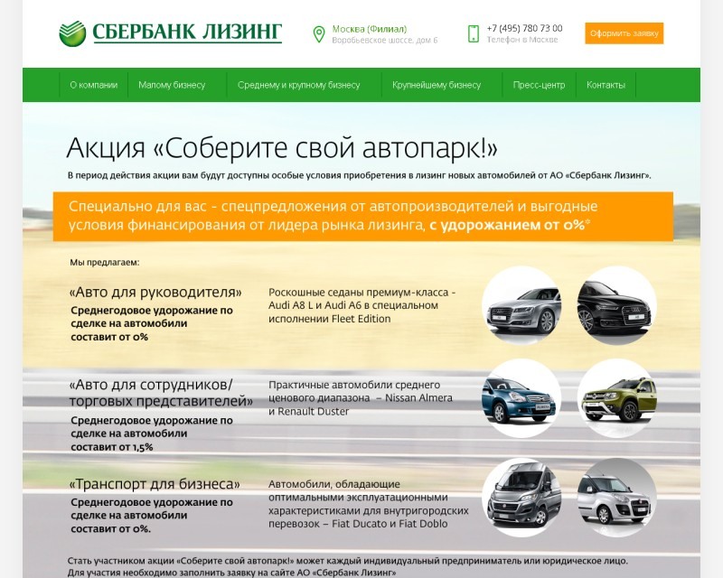 Сбербанк проводит акцию автолизинга 'Соберите свой автопарк'Сбербанк и «Сбербанк Лизинг» проводят акцию «Соберите свой автопарк», в рамках которой предлагают компаниям крупного и среднего бизнеса специальные условия приобретения легковых и грузовых автомобилей.