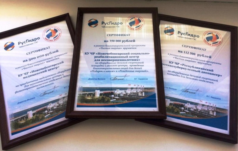 2,5 миллиона рублей направляет Чебоксарская ГЭС на благотворительность в 2016 годуВ рамках благотворительной программы РусГидро «Чистая энергия» Чебоксарская ГЭС вручила сертификаты руководителям 19 образовательных, медицинских учреждений и общественных организаций Новочебоксарска и Чувашии. Общая сумма помощи в 2016 году составляет 2,5 млн рублей.