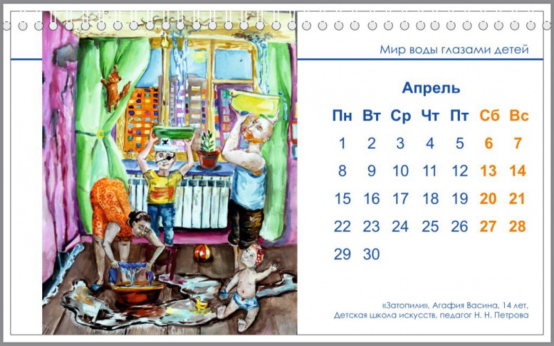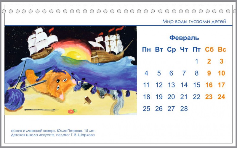 Впервые в этом году в календарь включили фотографию – коллективную работу учеников 11 класса школы № 13. Объединившись в команду «Фокус воды», они отличились на первом городском молодежном фотокроссе «В объективе ВОДА» – еще одном мероприятии Недели воды-2018. Тогда 21 команда из 130 школьников и студентов сделали фотоиллюстрации к стихотворению о воде и опубликовали их в ВКонтакте на специальной странице. Несмотря на ограниченное время (1 час), команды кроссеров сделали красивые и необычные снимки в разных уголках города. Фоторабота команды «Фокус воды» не только заслужила награду конкурса, но и украсила мартовскую страницу календаря «Мир воды глазами детей».