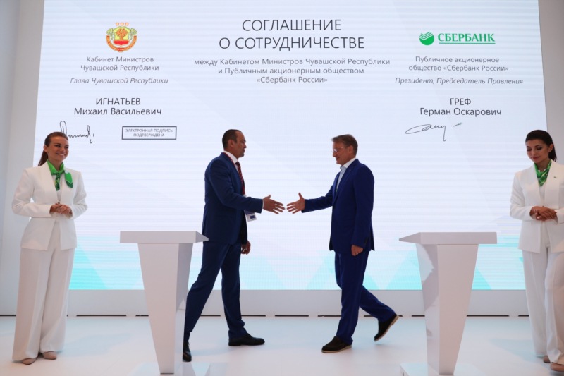 Подписи под соглашением поставили Глава Чувашской Республики Михаил Игнатьев и Президент, Председатель Правления Публичного акционерного общества «Сбербанк России» Герман Греф.