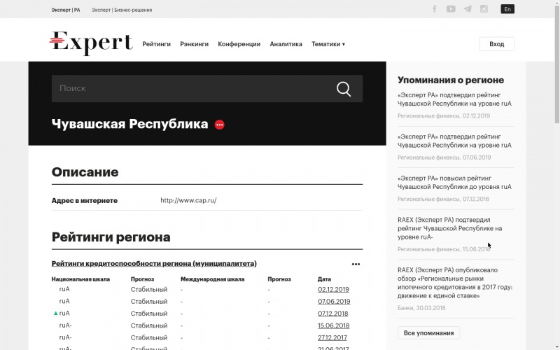 Чувашия подтвердила высокий уровень кредитоспособностиРейтинговое агентство "Эксперт РА" подтвердило рейтинг кредитоспособности Чувашской Республики на уровне ruА (умеренно высокий уровень кредитоспособности/финансовой надежности/финансовой устойчивости по сравнению с другими объектами рейтинга в Российской Федерации).