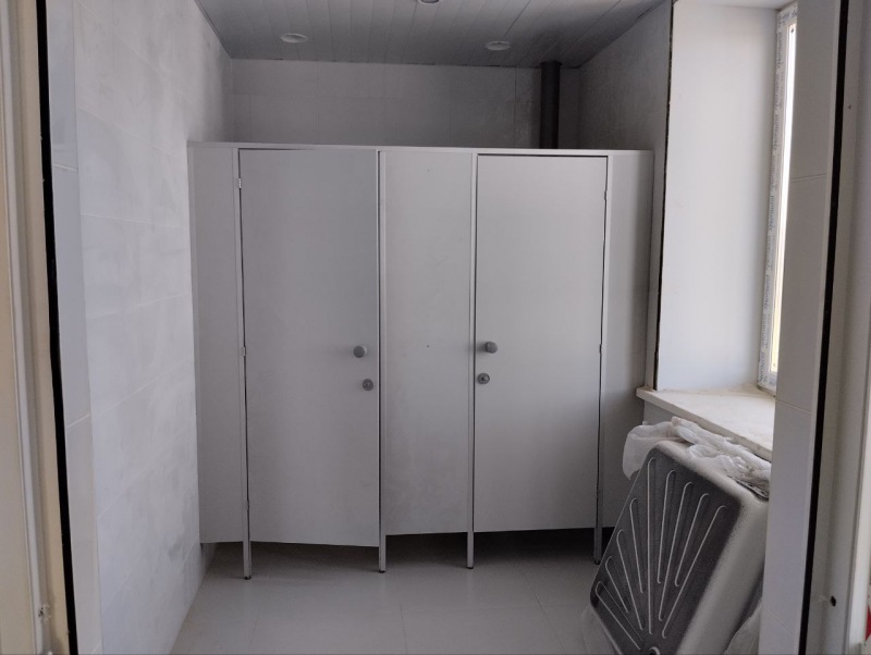 На сегодня ремонт выполнен на 88 %. Ведутся работы по установке стеклянной перегородки в кабинете приема врача, выполнено напольное покрытие линолеумом, полностью проведено электричество, в туалетах установлены сантехнические перегородки для разделения на туалетные кабины, в процедурных кабинетах проводятся работы по установке раковин. В данный момент основные силы направлены на реконструкцию лестничного марша.