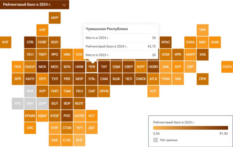 Чувашия с результатом в 43,75 баллов стала 26-й в списке. С аналогичными цифрами регион входил в перечень и в 2023 году.