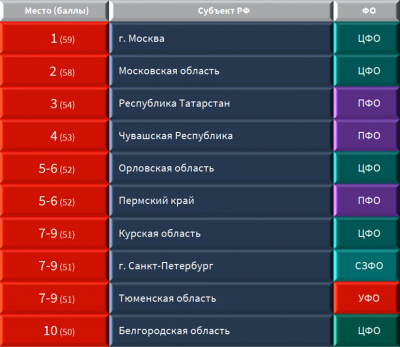 По итогам аналитики в тройку лидеров вошли город Москва – 59 баллов, Московская область – 58 баллов и Татарстан – 54 балла. Чувашия набрала 53 балла, заняв 4 строчку рейтинга в России.