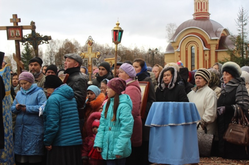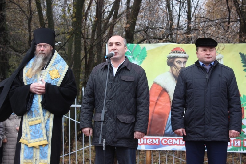 С поздравлениями и словами благодарности выступил глава администрации Канашского района В.Н. Степанов и начальник отдела военного комиссариата Чувашской Республики по городу Канаш, Канашскому и Янтиковскому районам Ю.В. Барышов, который от имени всех военнослужащих сделал подарок храму-часовне святых Петра и Февронии – подарил икону Святого великомученика Георгия Победоносца.