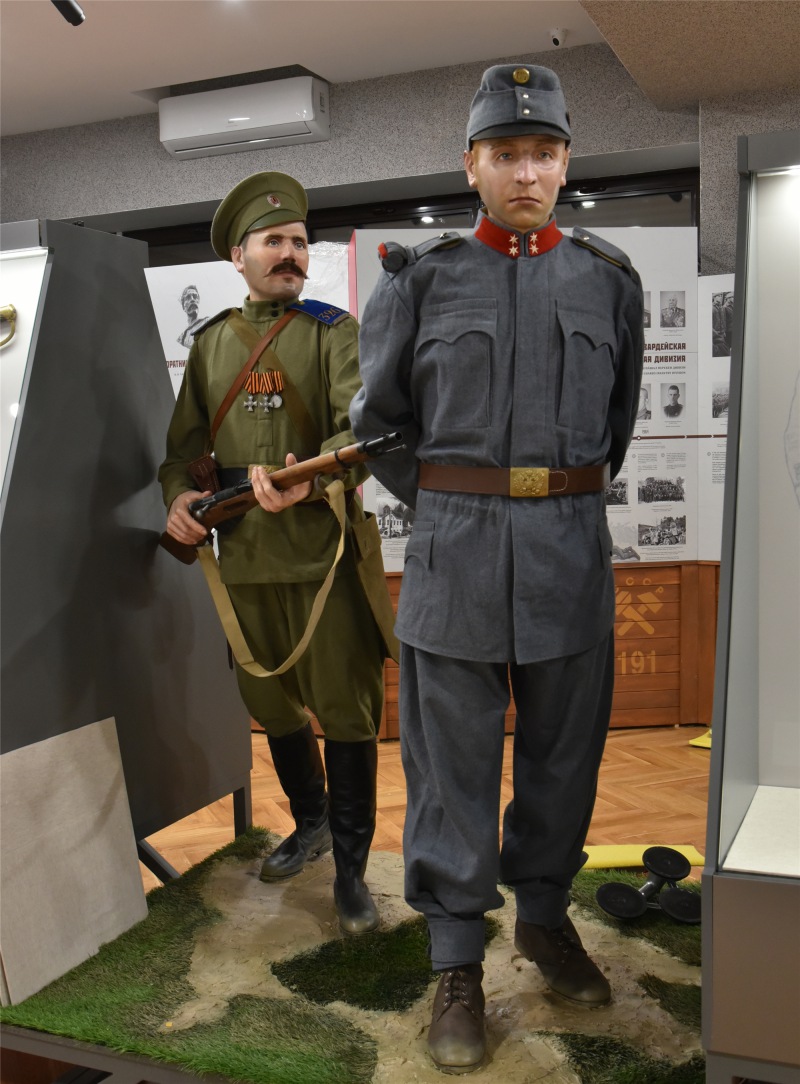 Специально для Музея Чапаева скульптор Эдгар Филиппов создал анатомические манекены, максимально воссоздающие реальные образы. Посетителей встретят солдат российской императорской армии, австро-венгерский офицер, казак и красноармеец в полном обмундировании.