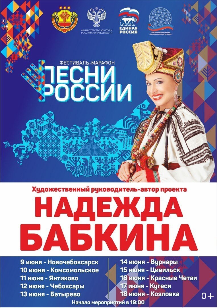 С 9 по 18 июня 2022 года состоятся благотворительные концерты шестнадцатого фестиваля - марафона "Песни России 2022". Стартовав в Новочебоксарске, участники фестиваля под руководством автора и художественного руководителя проекта Надежды Георгиевны Бабкиной, посетят десять городов и населенных пунктов республики. Маршрутными точками фестиваля станут г. Новочебоксарск, с. Комсомольское, с. Янтиково, г. Чебоксары, с. Батырево, пгт. Вурнары, г. Цивильск, с. Красные Четаи, пгт. Кугеси и г. Козловка.