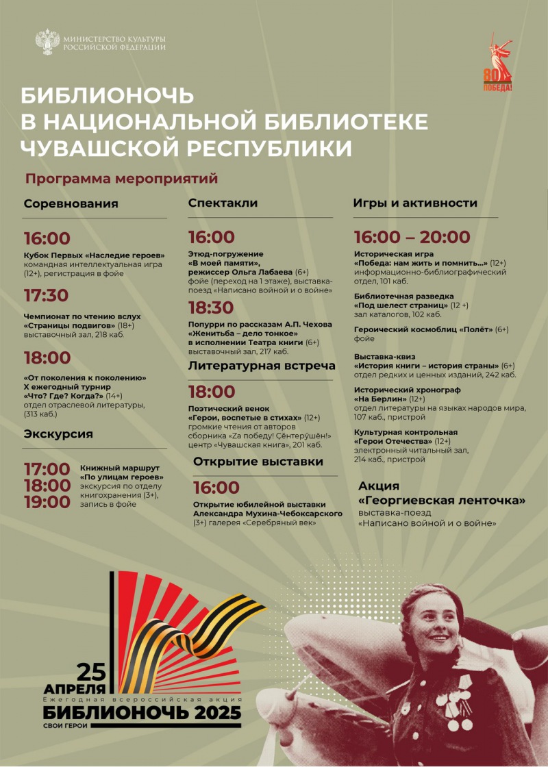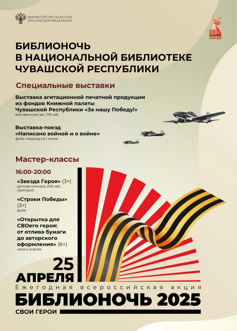 Национальная библиотека Чувашской Республики приглашает друзей, читателей и любителей интересно провести время, окунуться в мир героизма и отваги на Всероссийской акции «Библионочь – 2025»!