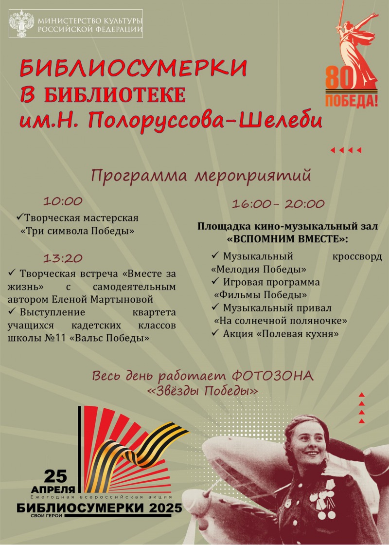 25 апреля Библиотеки города приглашают на «Библиосумерки-2025» в поддержку ежегодной всероссийской акции «Библионочь-2025». Тема акции в этом году – «Свои герои». Девиз звучит так: «Нет в России семьи такой, где б не памятен был свой герой».