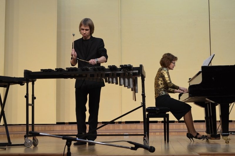 Также вниманию зрителей была представлена сказочная музыка – «Марш Черномора» из оперы «Руслан и Людмила» М. Глинки. Вибрафон – музыкальный инструмент, издающий поистине волшебные звуки и способный перенести наше воображение в какие-то неведомые дали… На нём исполнил произведение Алексей Анисимов, занимающийся у преподавателя Игоря Петровича Ванюшина. В ансамбле с Алексеем выступила концертмейстер Лилия Салихова.