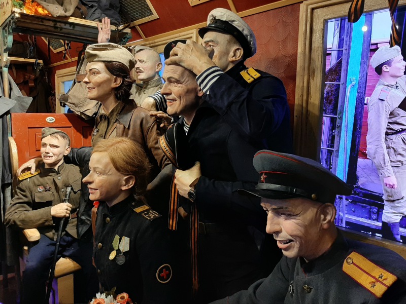 В составе «Поезда Победы» восемь вагонов, каждый из которых - отдельная инсталляция. Первый вагон, который увидели ребята, был посвящен мирному времени. Они увидели зарисовки из довоенной жизни страны, которые сменились драматическими сценами с передовой и из блокадного Ленинграда. В следующих вагонах посетители выставки побывали в санчасти, в концлагере, в бане на колесах, в лаборатории, в штабном вагоне маршала Советского Союза Константина Рокоссовского и в последнем вагоне, где уже радостные, но потерянные лица пассажиров ликовали и встречали Победу