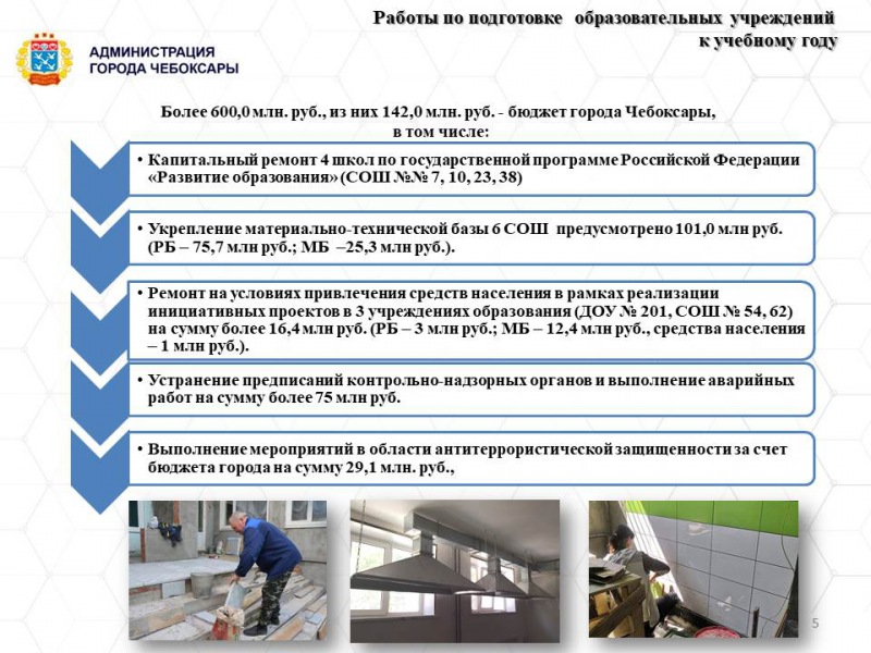 Справочно: Для четырех школ (СОШ №№ 7, 10, 23, 38) приемка будет организована по отдельному графику. В рамках подготовки учреждений образования в текущем году проводятся работы на сумму более 600 млн рублей, из них 142 млн рублей составляет бюджет г. Чебоксары, в том числе: