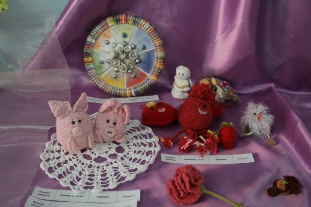 Не менее интересными были шедевры рукотворного творчества – вышивка бисером студентки 3 курса Любови Алексеевой. Без пяти минут дипломированный специалист - студентка 4 курса Валентина Лученкова удивила всех работой «Свадебный подарок», которую исполнила в технике вышивки лентами.