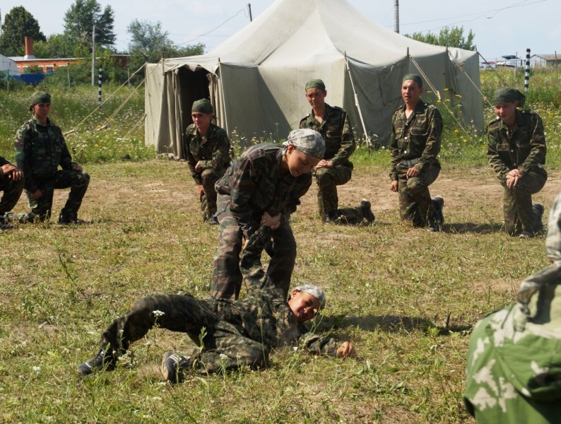 В свою очередь воспитанники лагеря продемонстрировали, чему они научились за время, проведенное здесь: приемы рукопашного боя, строевые приемы и движения без оружия, торжественный марш в составе роты с песней.