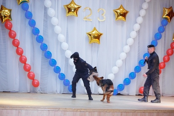 Тепло было встречено поздравительное слово и.о. заместителя начальника Управления Федеральной службы Российской Федерации по контролю за оборотом наркотиков по Чувашской Республике, полковника полиции Николая Ильина. Он отметил, что "любовь к Родине должна быть связана со знанием истории и культуры своей страны, республики". Николай Федорович вручил дипломы УФСКН РФ студентам 2 курса юридического факультета Анастасии Леонтьевой и экономического факультета Людмиле Ивановой, которые заняли 3 место во Всероссийском конкурсе на лучшую профилактическую антинаркотическую работу в студенческих средствах массовой информации и медиаобразованиях. Наиболее впечатляющим номером стало выступление сотрудников УФСКН России по Чувашской Республике - старшего кинолога, инспектора, майора полиции Семенова Алексея и кинолога-инспектора, старшего лейтенанта полиции Александра Мишкина со служебной собакой Бертой. Профессионалы продемонстрировали зрителям навыки и умения в дрессировке собак. Без аплодисментов публики не остался ни один продемонстрированный элемент. Кинолог вместе со своим четвероногим помощником показал, как собаки по запаху разыскивают потерянные вещи, задерживают условного нарушителя, выполняют команды.
