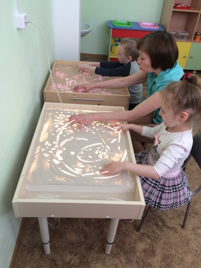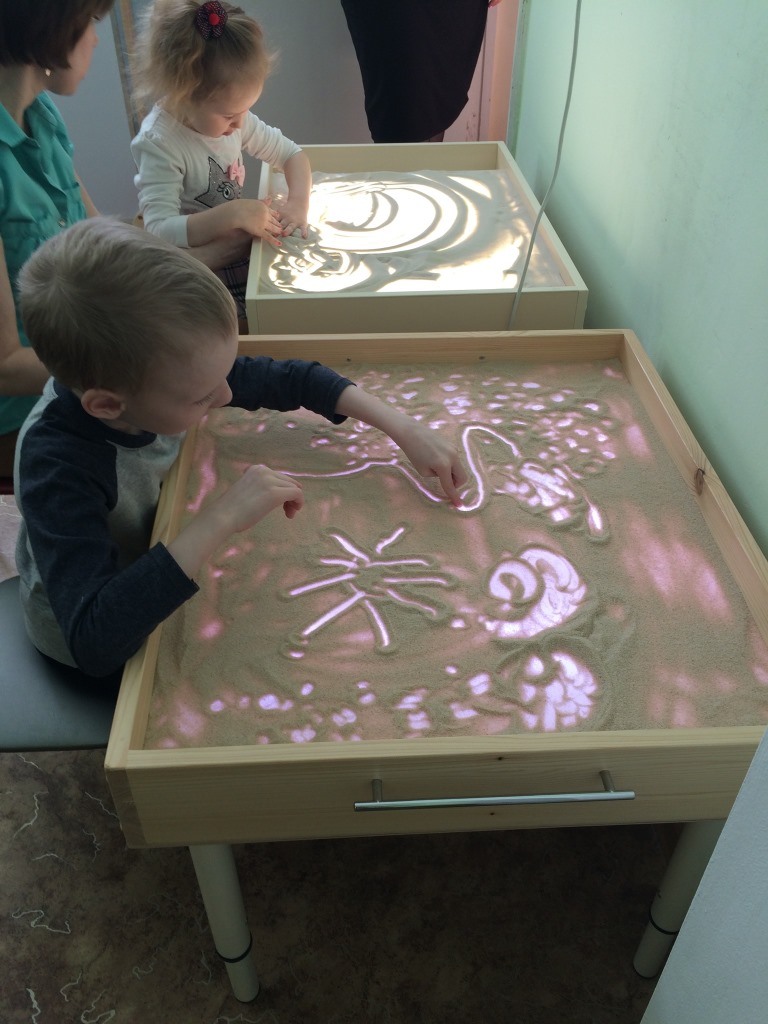 В детсаду «Поляночка» малыши могут рисовать песком на специальных столах с разноцветной подсветкой и музыкальным сопровождением. Круглый год на занятиях детям можно не только строить сооружения из песка, но и поливать его водой, лепить фигурки, оставлять и изучать следы, разыгрывать сценки с помощью игрушек, красивых камешков, ракушек. Все это жизненно необходимо для детей с ограниченными физическими возможностями, так как ученые доказали, что развитие руки тесно связано с развитием речи и мышлением ребенка.