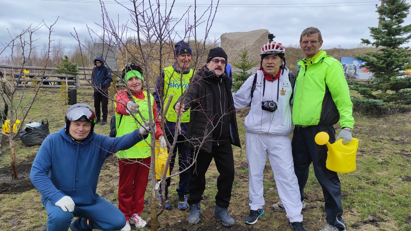 Через полтора часа на финише в Саду покорителям космоса гостей встретил неутоимимый садовод и энтузиаст Юрий Соколов, а на Аллее велосипедистов рядом с баннером с фотографией космонавта с позывным «Сокол» - Андрияна Николаева (на велосипеде «Старт-шоссе») были приготовлены ели для посадки. Но сначала состоялось поднятие на флагшток флага под гимн Чувашской Республики, возложение цветов к памятнику первому отряду космонавтов, а потом закипела работа по посадке деревьев. Славно потрудились, пора и отдохнуть – и попробовать любимое блюдо Андрияна – уху, сваренную заботливым хозяином Сада, теперь уже называемого «Соколиное гнездо» или «Кăйкăр йăви».