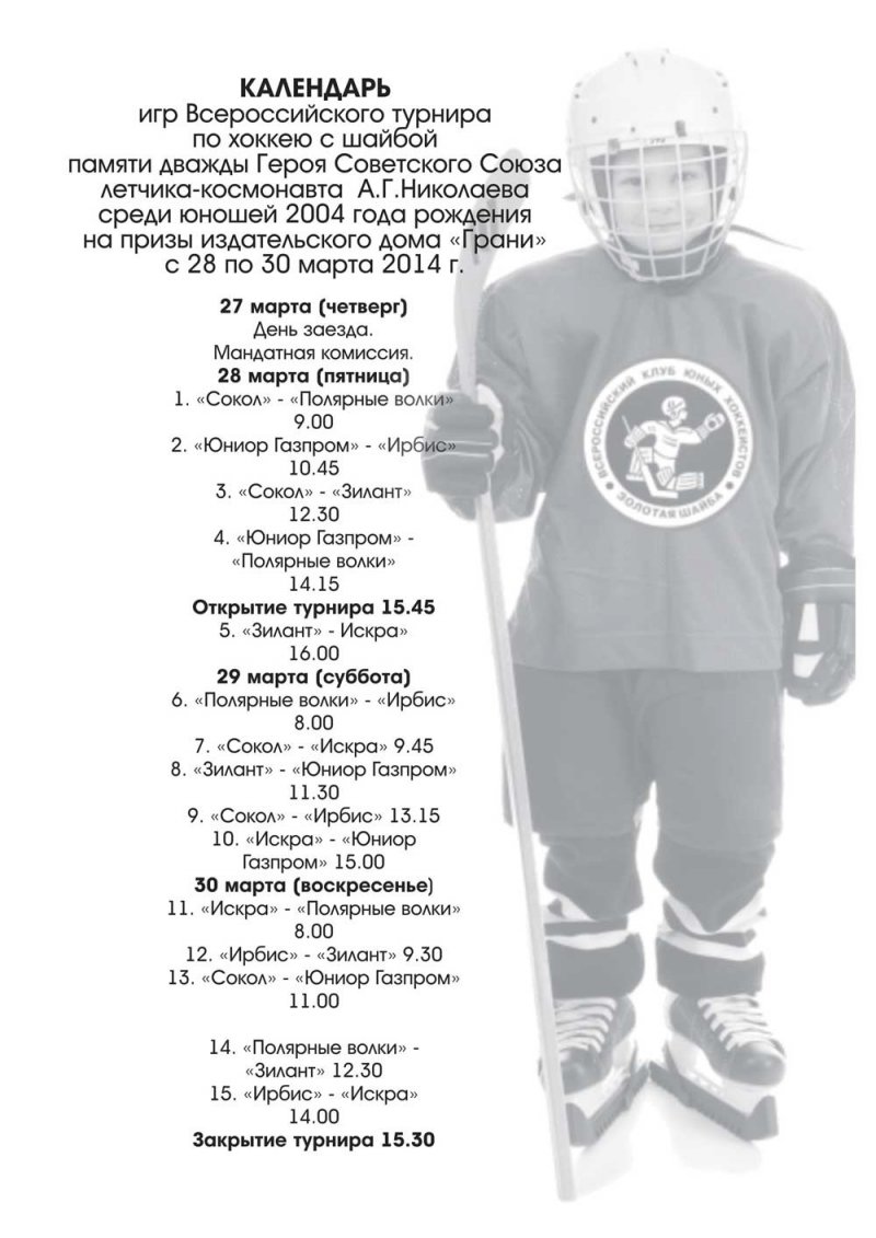 В пятницу, 28 марта, на новочебоксарском ледовом стадионе “Сокол” стартует традиционный Всероссийский турнир по хоккею с шайбой памяти дважды Героя Советского Союза летчика-космонавта Андрияна Николаева на призы газеты “Грани” среди младших юношей 2004 года рождения.