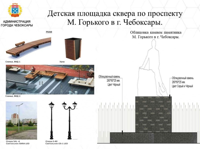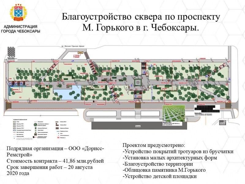 - Сквер по проспекту М. Горького. Стоимость работ - 41,87 млн рублей. Проект предусматривает благоустройство территории и установку малых архитектурных форм, облицовку памятника, установку системы видеонаблюдения, обновление системы наружного освещения, озеленение. Контракт на выполнение работ заключен с подрядной организацией ООО "Дорисс-Ремстрой". Срок завершения работ - до 20 августа 2020.