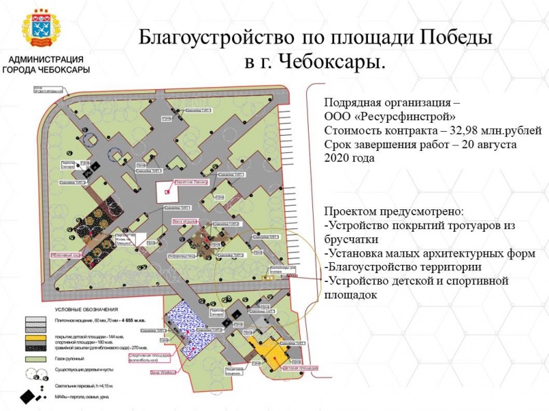 - Парк на площади Победы. Стоимость работ - 32,98 млн рублей. По проекту предусмотрены благоустройство территории сквера, обустройство его малыми архитектурными формами, установка системы видеонаблюдения, строительство сети наружного освещения, озеленение. Работы по благоустройству территории будут проведены подрядной организацией ООО "РесурсФинСтрой" до 20 августа 2020 г.