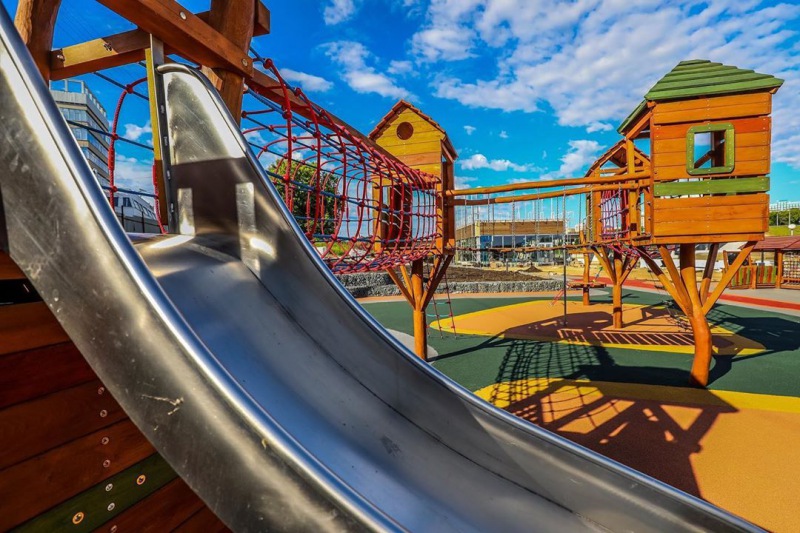 В новом парке каждый найдет, чем заняться. Для подростков запроектирован холм, на который можно забраться и по лестнице, и по траве, покрывающей часть холма, и по скалолазной стенке. Для малышей оборудована отдельная территория с маленькой горкой и зоной для игр с песком летом и снегом зимой. Детям дошкольного и школьного возраста сделали большую площадь для игр. Ее наполнили лазательными элементами: подвесным мостом между двумя островами, тарзанкой, батутом и качалкой, предназначенной для детей с ограничениями опорно-двигательного аппарата.