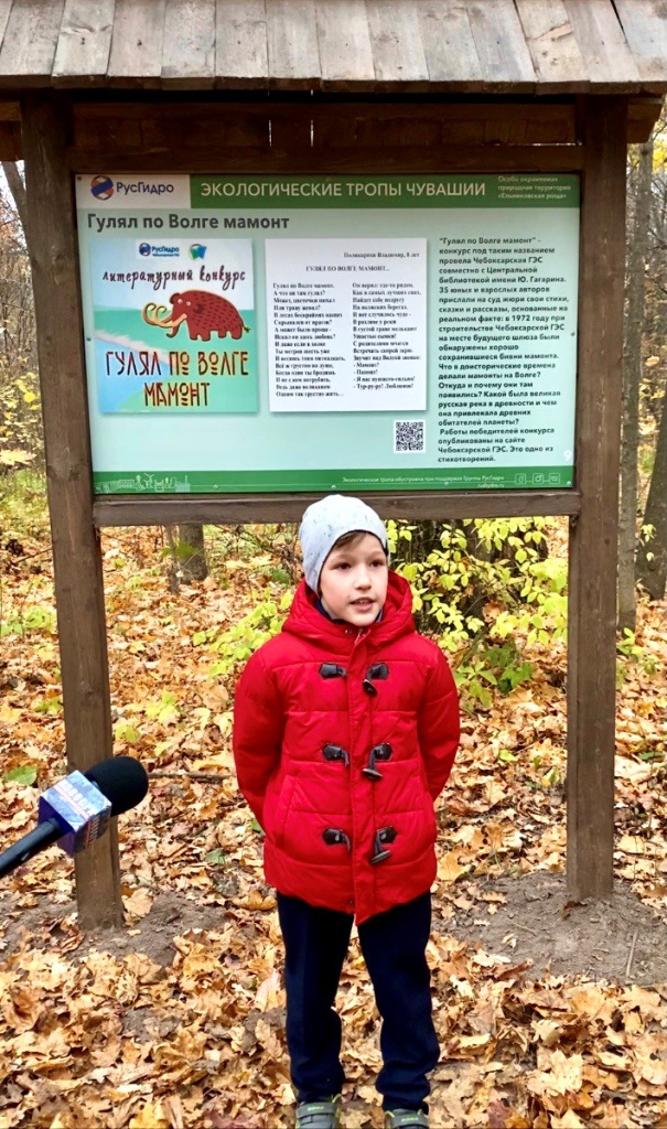 Еще одним почетным гостем стал новочебоксарский школьник Владимир Поликарпов, победитель литературного конкурса «Гулял по Волге мамонт», который провела Чебоксарская ГЭС совместно с Центральной библиотекой имени Ю. Гагарина в честь Дня воды-2021. 35 юных и взрослых авторов прислали на суд жюри свои стихи, сказки и рассказы о бивнях мамонта на месте будущей ГЭС. Стихотворение Володи Поликарпова, одно из лучших по итогам конкурса, представлено на одной из остановок экотропы. Символично, что юный поэт – внук ветерана строительства Чебоксарского гидроузла, Владимира Поликарпова-старшего. В честь деда Володя выразительно прочитал свои стихи для гостей нового маршрута.
