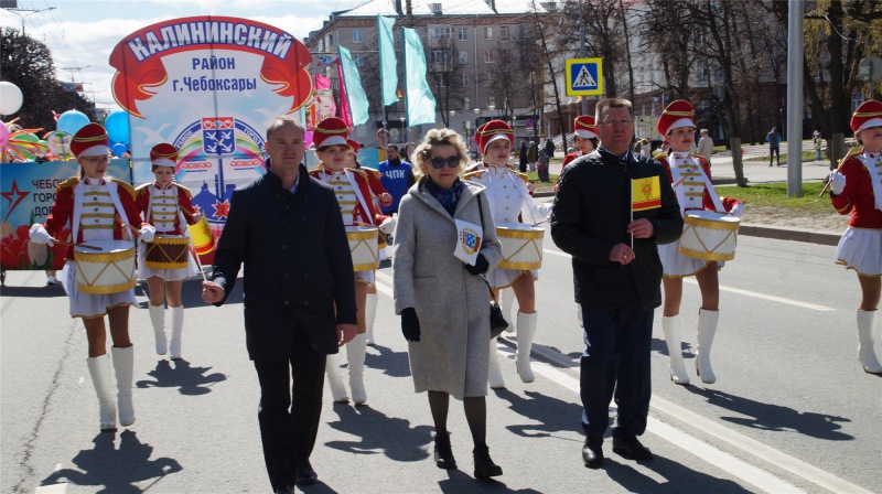 В составе большой и дружной колонны единым строем от улицы Николаева до Красной площади прошёл Калининский район г. Чебоксары. Сотрудники администрации, промышленных предприятий, учебных заведений, больниц, школ, обслуживающих организаций, размахивая шарами, флагами, цветами, демонстрировали солидарность с трудящимися всей планеты.