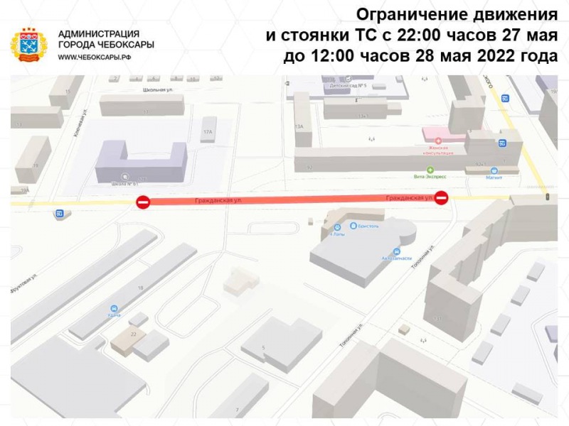 Для устройства пересечки ливневой канализации через ул. Гражданскую будет ограничено движение всех видов транспорта на участке от ул. Тополиная до пересечения с ул. Фруктовая. Ограничение начнет действовать с 22:00 27 мая (пятница) до 12:00 28 мая (суббота).