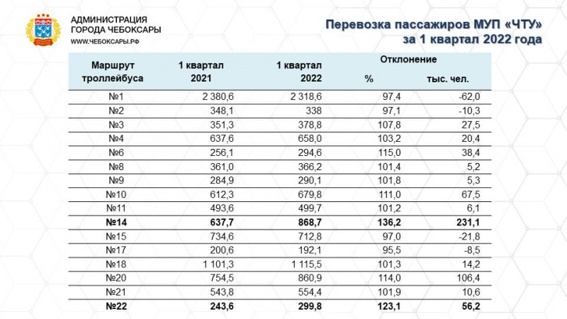 Максимальный прирост отмечается на 14 маршруте, который продлён до Солнечного микрорайона и ЖК "Ясная поляна" - 36%. Чебоксарцы стали больше пользоваться и "рогатым" № 22. Это связано с уходом нелегального перевозчика на автобусе № 49. Также увеличение пассажиропотока от 3 до 15% произошло на маршрутах №№ 3,4,6,10,20.