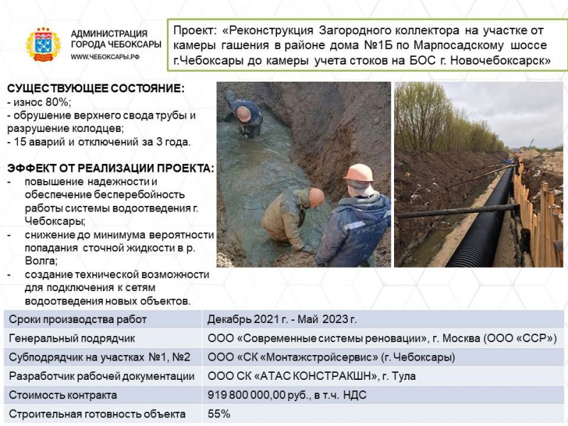 В 2018 году город Чебоксары был отобран для участия в проекте "Развитие систем водоснабжения и водоотведения в городах Российской Федерации". В соответствии с договором между Минстроем России, Чувашской Республикой и администрацией города Чебоксары до 2024 года будут выполнены работы по реконструкции Загородного коллектора на участке от дома №1Б по Марпосадскому шоссе г. Чебоксары до ГУП "Биологические очистные сооружения" (г. Новочебоксарск), а также модернизации оборудования канализационных насосных станций. Общая стоимость контрактов - 2,77 млрд рублей.