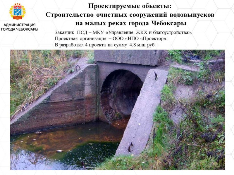 В разработке находится проектная документация еще на пять новых очистных сооружений: для водовыпусков на малых реках города Чебоксары; ливневых очистных сооружений в мкр "Грязевская стрелка"; в районе ул. Якимовская; на р.Трусиха в парке "Лакреевский лес" с подключением существующего коллектора и сети ливневой канализации в комплексе с очистными сооружениями в мкр "Байконур". Общая стоимость проектов на данные объекты - 19,7 млн рублей.