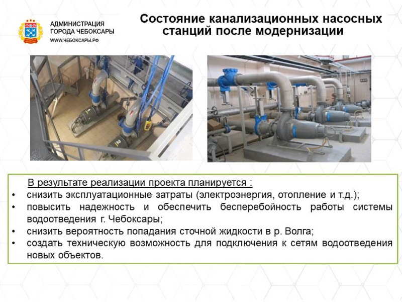 В результате будет достигнуто снижение эксплуатационных затрат (электроэнергия, отопление и т.д.), повышена надежность и обеспечена бесперебойность работы системы водоотведения г.Чебоксары, снижена вероятность попадания сточной жидкости в р. Волга и создана техническая возможность для подключения к сетям водоотведения новых объектов.