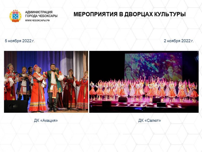2 ноября ДК "Салют" приглашает чебоксарцев на праздничный концерт. В ДК "Акация" концерт состоится 5 ноября.