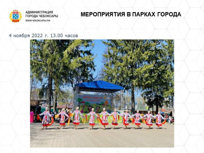 В честь Дня народного единства в столичных учреждениях культуры, образования и парках пройдет серия концертов и праздничных акций. Об этом сообщается в пресс-релизе, опубликованном на сайте Администрации г. Чебоксары Чувашской Республики.