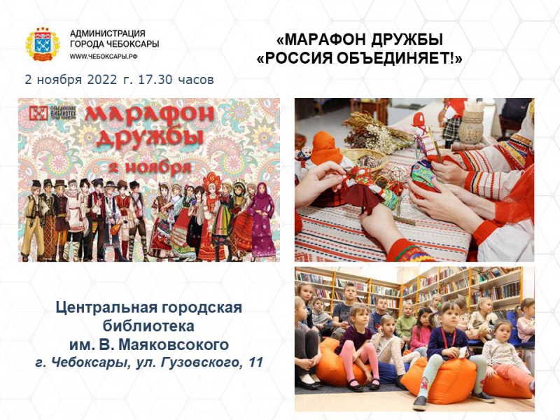 2 ноября в Центральной городской библиотеки им. В. Маяковского пройдет марафон дружбы народов "Россия объединяет!". Гости праздника смогут принять участие в лектории "PRO-Россию" об исторических событиях, предшествовавших появлению праздника Дня народного единства; квест-игре "По дорогам русского фольклора" о традициях и культуре русского народа; мастер-классе по изготовлению кукол-оберегов.